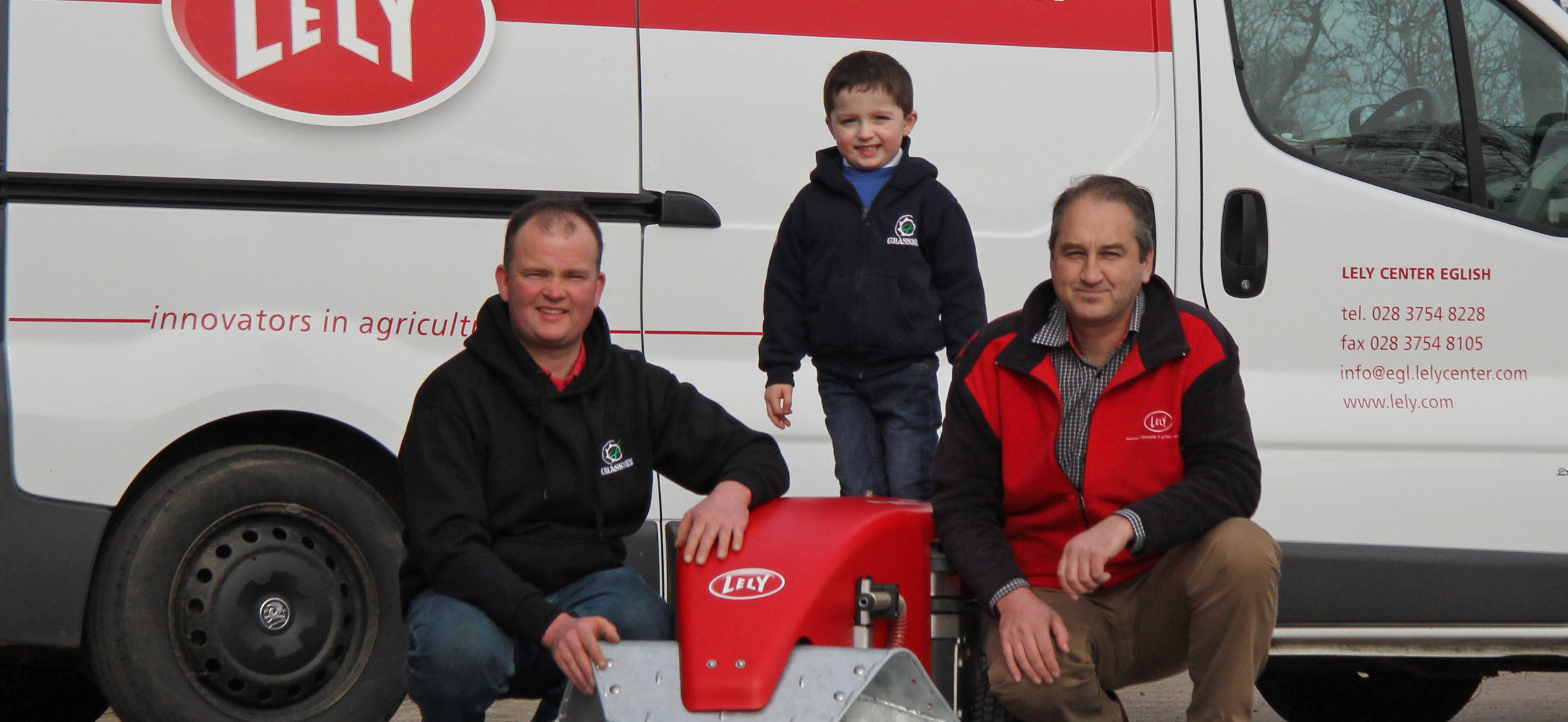 Ashton Wallace, and dad Alan, from Ashdale Farm in Antrim, take delivery of their prize from Jim Irwin, Lely Center Eglish.