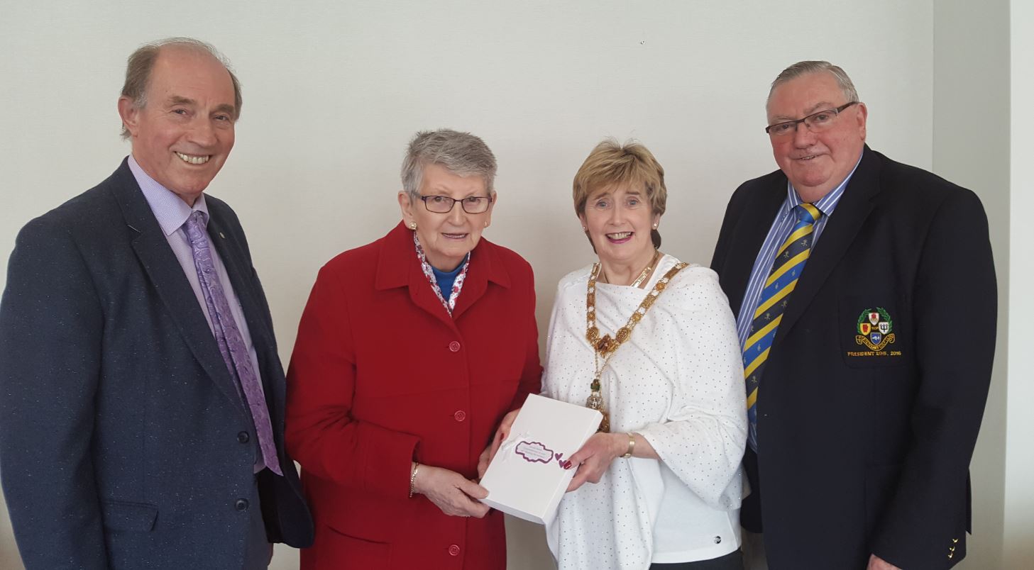 The Mayor of Causeway Coast and Glens Borough Council, Alderman Maura Hickey with her husband Liam recently hosted afternoon tea for Jim and Susan Donaghy from Portstewart to mark their Diamond wedding anniversary. Susan can be seen here receiving a small token of appreciation.